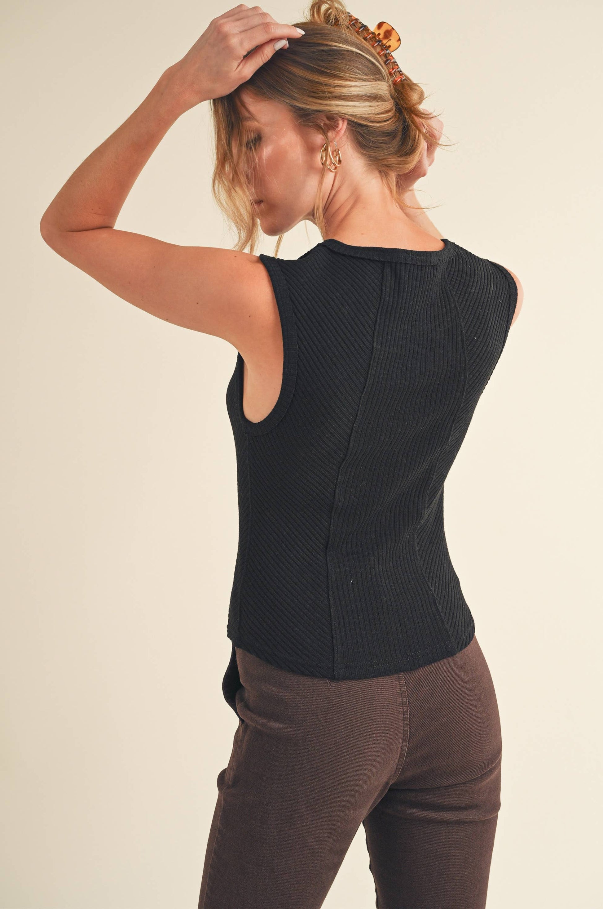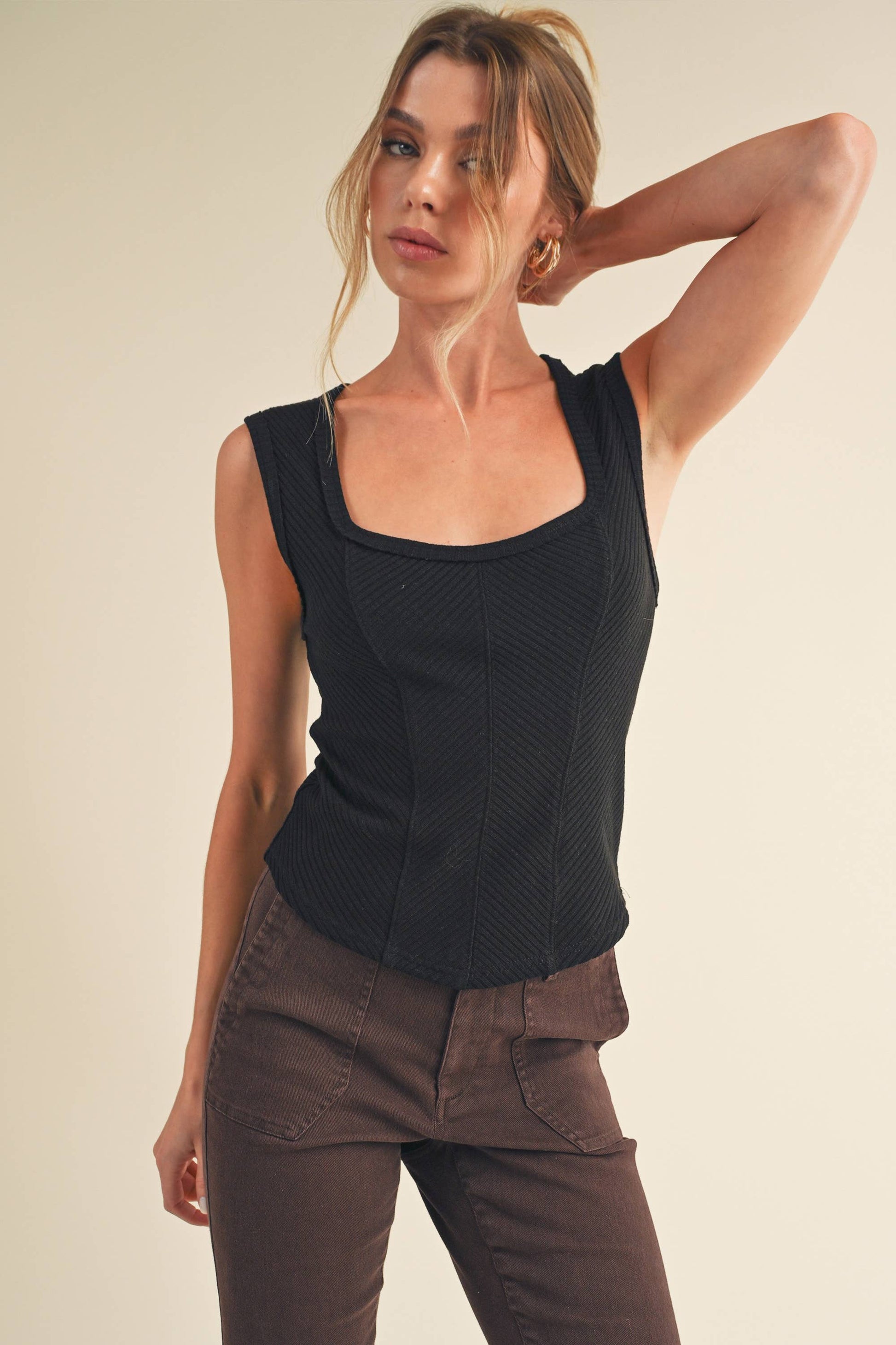 The Adelle tank is a must have for your basics. Featuring a sweetheart neckline. The ribbed fabric adds texture, enhancing its casual charm. Mitered seams provide a tailored touch, ensuring a flattering and stylish fit. A versatile piece that effortlessly combines comfort and sophistication.