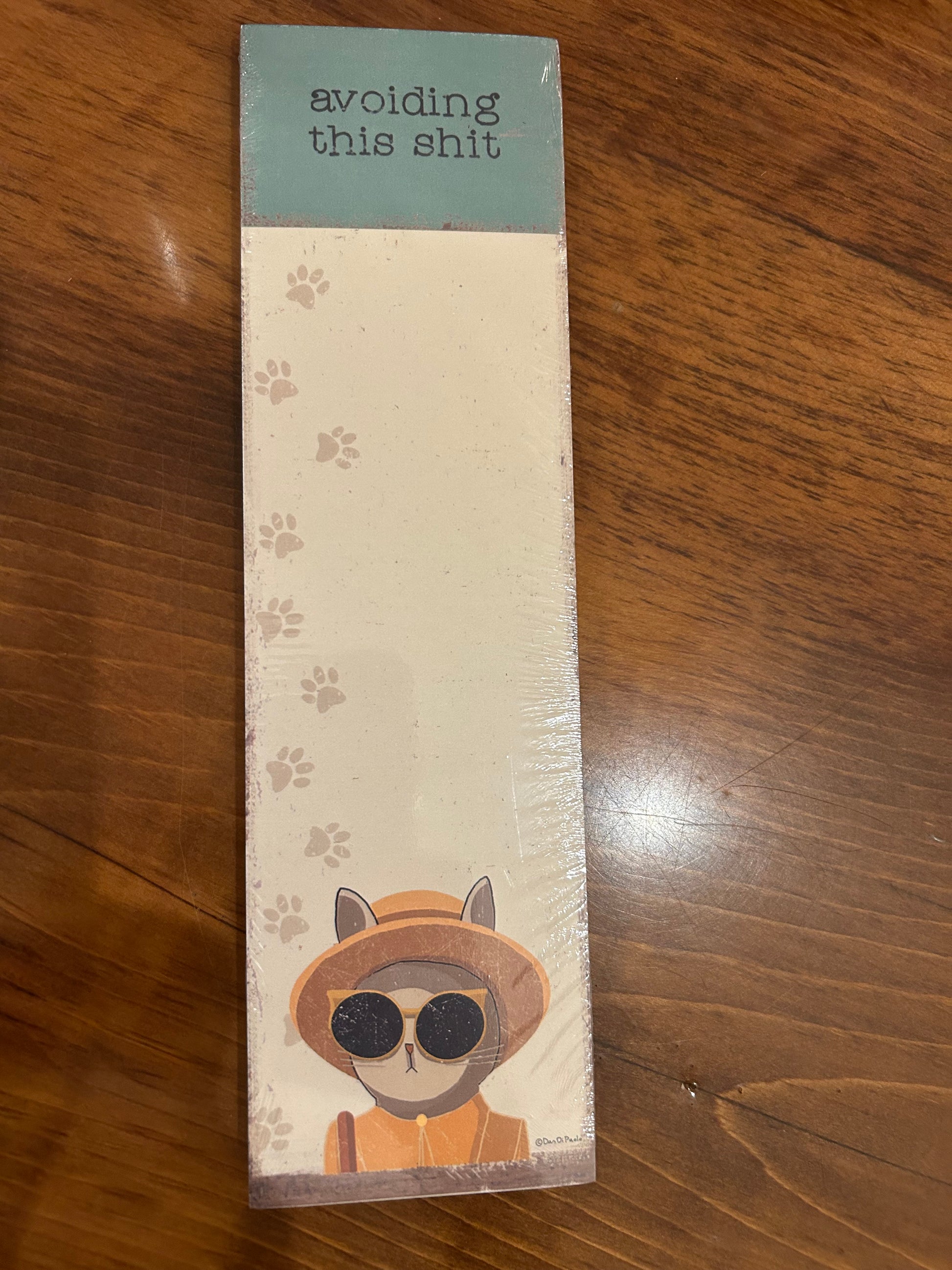 A list notepad displaying a rustic design of a cat in a cool outfit with a sassy sentiment that reads "Avoiding This Shit" as well as decorative space to write. Our Avoiding This list pad includes 60 pages and a strong magnet to easily hang on magnetic surface for display. Proudly made in the USA. A fun pet-themed gift perfect for adding functional style to any space.