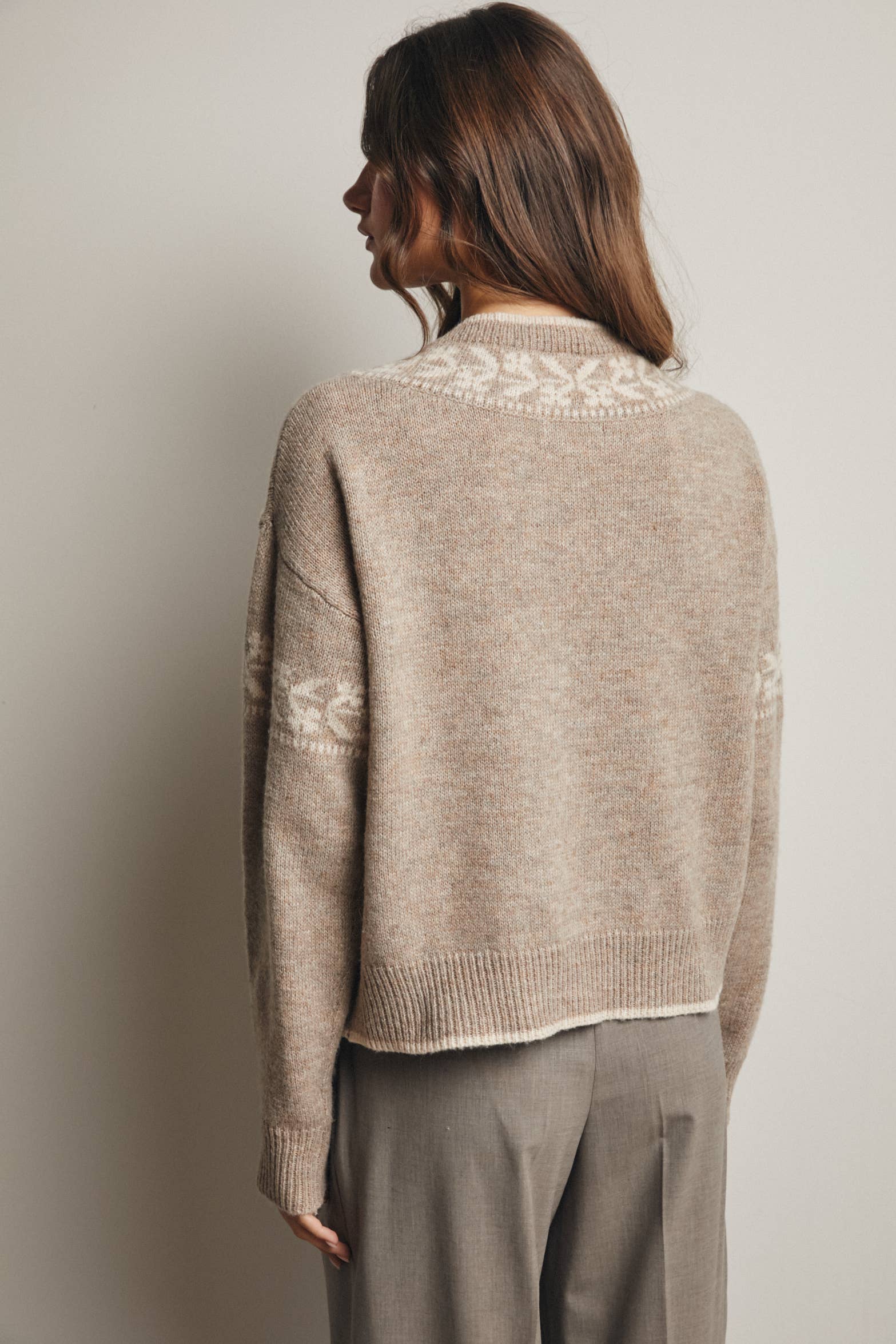 This soft sweater knit is cozy. Adjustable front tie for a vintage-inspired touch. Subtle ivory fair isle patterning along neckline and sleeves for a classic Nordic feel. Relaxed Silhouette is an easy fit with dropped shoulders for comfort and layering. Rib-knit hem and cuffs for a clean, polished look. Perfect for pairing with trousers, skirts, or denim.
