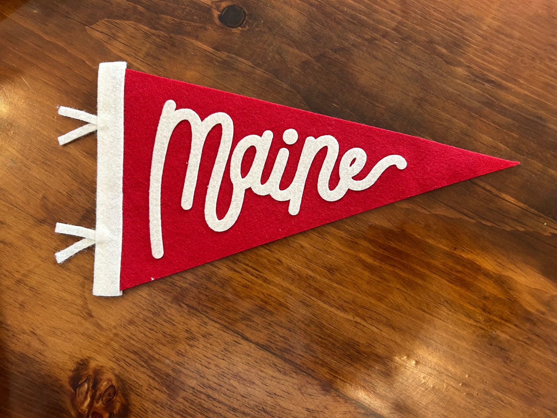 Hand lettered MAINE wool pennant measurements : 10 in. x 6 in. • slight variation may occur from pennant to pennant due to their handmade nature.
